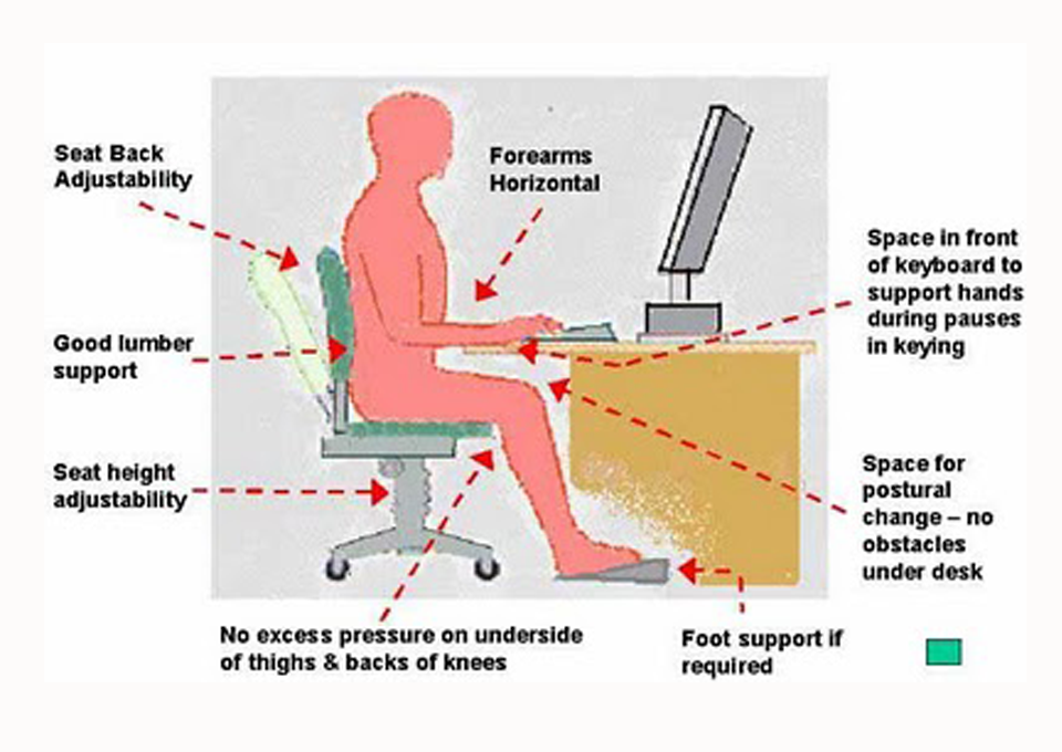 - Adjust the height of the chair to keep the upper edge of the VDT screen below the level of your eyes so that you do not have to extend your neck or keep your eyes wide open to see the screen.